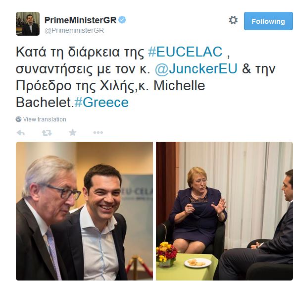 Φωτογραφίες από τις συναντήσεις του, στις Βρυξέλλες, ανήρτησε στον προσωπικό του λογαριασμό στο Twitter, ο Πρωθυπουργός, Αλέξης Τσίπρας. Συγκεκριμένα, ο κ. Τσίπρας, ανέβασε φωτογραφία με τον Πρόεδρο της Κομισιόν, Ζαν Κλοντ Γιούνκερ και με την Πρόεδρος της Χιλής, Μισέλ Μπατσελέτ.