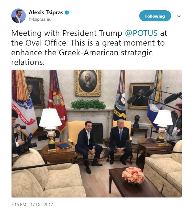“Συνάντηση με τον Πρόεδρο Τραμπ στο Οβάλ Γραφείο. Αυτή είναι μια σπουδαία στιγμή για την ενίσχυση των ελληνοαμερικανικών στρατηγικών σχέσεων”, έγραψε στο twitter ο Έλληνας πρωθυπουργός, ο οποίος ανέβασε και μια φωτογραφία από τη συνάντησή τους.