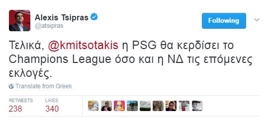 Με ένα σκωπτικό σχόλιο «παρενέβη» ο πρωθυπουργός Αλέξης Τσίπρας στο θρίαμβο της Μπαρτσελόνα. Όπως έγραψε στον προσωπικό του λογαριασμό στο twitter, «τελικά, @kmitsotakis η PSG (σ.σ. Παρί Σεν Ζερμέν) θα κερδίσει το Champions League όσο και η ΝΔ τις επόμενες εκλογές».