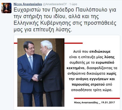 Συγκεκριμένα ο κ. Αναστασιάδης σε ανάρτηση στον λογαριασμό του στο twitter, μετά τη συνάντησή του με τον Παυλόπουλο, επεσήμανε: