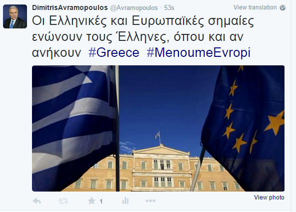 «Οι Ελληνικές και Ευρωπαϊκές σημαίες ενώνουν τους Έλληνες, όπου και αν ανήκουν» έγραψε ο Δημήτρης Αβραμόπουλος.