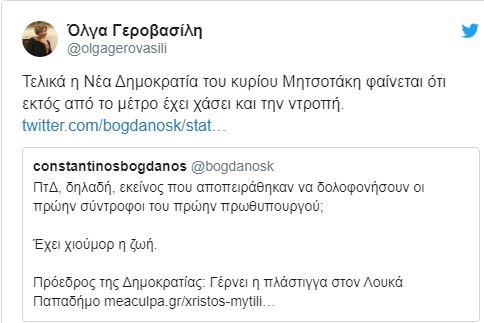 Από την πλευρά της, η γραμματέας της Κοινοβουλευτικής Ομάδας του ΣΥΡΙΖΑ Όλγα Γεροβασίλη, σημειώνει πως η ΝΔ του κυρίου Μητσοτάκη “εκτός από το μέτρο έχει χάσει και την ντροπή”.