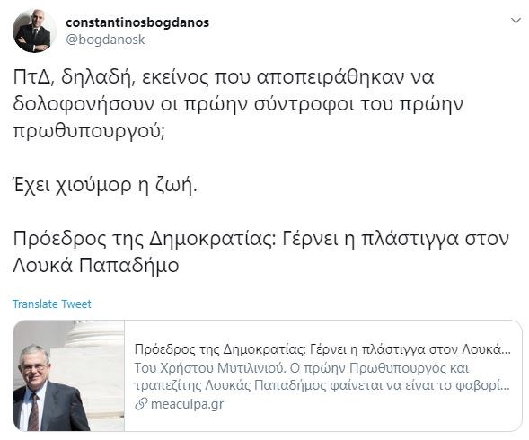 Σε ανάρτηση που έκανε ο βουλευτής της Νέας Δημοκρατίας, επισυνάπτοντας δημοσίευμα το οποίο υποστηρίζει πως “Γέρνει η πλάστιγγα στον Λουκά Παπαδήμο”, σχολιάζει: “ΠτΔ, δηλαδή, εκείνος που αποπειράθηκαν να δολοφονήσουν οι πρώην σύντροφοι του πρώην πρωθυπουργού; Έχει χιούμορ η ζωή”.