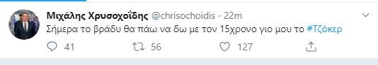 Με ένα tweet ο υπουργός Προστασίας του Πολίτη, Μιχάλης Χρυσοχοΐδης σχολιάζει το θέμα που έχει προκύψει μετά την έφοδο αστυνομικών σε κινηματογράφους όπου προβάλλεται η ταινία “Τζόκερ“.«Σήμερα το βράδυ θα πάω να δω με τον 15χρονο γιο μου το #Τζόκερ», έγραψε με νόημα ο Μιχάλης Χρυσοχοΐδης.