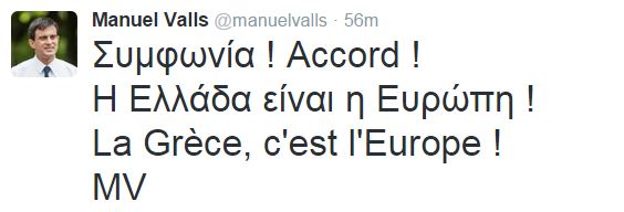 «Συμφωνία! Η Ελλάδα είναι η Ευρώπη !», έγραψε στα ελληνικά στον προσωπικό του λογαριασμό στο twitter ο Πρωθυπουργός της Γαλλίας, Μανουέλ Βαλς.