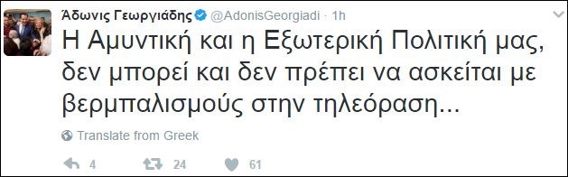 Τις δηλώσεις του υπουργού Άμυνας Πάνου Καμμένου σχετικά με τις προκλήσεις των Τούρκων στα Ίμια σχολίασε, μέσω του προσωπικού του λογαριασμού στο Twitter ο Άδωνις Γεωργιάδης.«Η Αμυντική και η Εξωτερική Πολιτική μας, δεν μπορεί και δεν πρέπει να ασκείται με βερμπαλισμούς στην τηλεόραση», έγραψε ο αντιπρόεδρος της Νέας Δημοκρατίας.