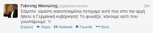 Ο κ. Μανώλης έγραψε: «Σόιμπλε: είμαστε ικανοποιημένοι, πετύχαμε αυτό που από την αρχή ήθελε η Γερμανική κυβέρνηση! Το φωνάζει, κάνουμε αυτό που γουστάρουμε!»