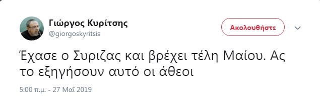 «Έχασε ο Σύριζας και βρέχει τέλη Μαΐου. Ας το εξηγήσουν αυτό οι άθεοι», αναφέρει σε tweet που έκανε ο βουλευτής του ΣΥΡΙΖΑ Γιώργος Κυρίτσης σχολιάζοντας με χιουμοριστικό τρόπο το αποτέλεσμα των εκλογών.