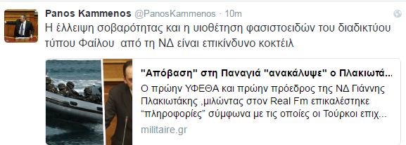 «Η έλλειψη σοβαρότητας και η υιοθέτηση φασιστοειδών του διαδικτύου τύπου Φαήλου από τη ΝΔ είναι επικίνδυνο κοκτέιλ» έγραψε ο κ. Καμμένος στο twitter παραθέτοντας και σχετικό δημοσίευμα με τις δηλώσεις του κ. Πλακιωτάκη.