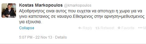 Αυτό ήταν το tweet που ανάρτησε ο βουλευτής, Κώστας Μαρκόπουλος, στον προσωπικό του λογαριασμό στο Twitter, αναφερόμενος εμμέσως πλην σαφώς στον πρόεδρο του ΣΥΡΙΖΑ, Αλέξη Τσίπρα.