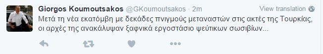 «Μετά τη νέα εκατόμβη με δεκάδες πνιγμούς μεταναστών στις ακτές της Τουρκίας, οι αρχές της ανακάλυψαν ξαφνικά εργοστάσιο ψεύτικων σωσιβίων…», έγραψε χαρακτηριστικά στον προσωπικό του λογαριασμό στο twitter.
