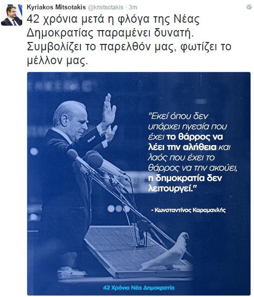 «42 χρόνια μετά η φλόγα της Νέας Δημοκρατίας παραμένει δυνατή», έγραψε στον προσωπικό του λογαριασμό στο twitter ο πρόεδρος της ΝΔ, Κυριάκος Μητσοτάκης για την επέτειο ίδρυσης του κόμματος.