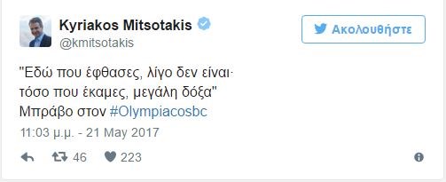 «”Εδώ που έφθασες, λίγο δεν είναι. Tόσο που έκαμες, μεγάλη δόξα” Μπράβο στον #Olympiacosbc» έγραψε αμέσως μετά την λήξη του αγώνα.