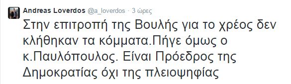 Ο βουλευτής του ΠΑΣΟΚ έγραψε στον προσωπικό του λογαριασμό στο Twitter: «Στην επιτροπή της Βουλής για το χρέος δεν κλήθηκαν τα κόμματα. Πήγε όμως ο κ.Παυλόπουλος. Είναι Πρόεδρος της Δημοκρατίας, όχι της πλειοψηφίας.»