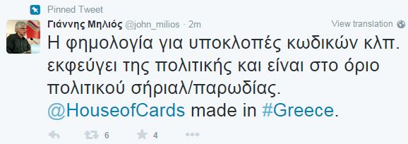“H φημολογία για υποκλοπές κωδικών κλπ. εκφεύγει της πολιτικής και είναι στο όριο πολιτικού σήριαλ/παρωδίας. House of cards made in Greece.”