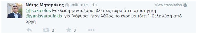 Ο βουλευτής της ΝΔ και πρώην υπουργός στο tweet του αναφέρεται στον υπουργό Οικονομικών Γιάνη Βαρουφάκη γράφοντας: “Ευκλείδη φαντάζομαι βλέπεις τώρα ότι η στρατηγική του Γιάνη Βαρουφάκη για “γέφυρα” ήταν λάθος, το έγραψα τότε. Ήθελε λύση από την αρχή”.