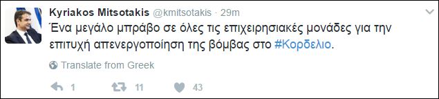 «Ένα μεγάλο μπράβο σε όλες τις επιχειρησιακές μονάδες για την επιτυχή απενεργοποίηση της βόμβας στο Κορδελιό» έγραψε ο πρόεδρος της ΝΔ.