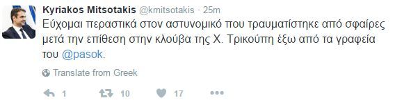 «Εύχομαι περαστικά στον αστυνομικό που τραυματίστηκε από σφαίρες μετά την επίθεση στην κλούβα της Χ. Τρικούπη έξω από τα γραφεία του ΠΑΣΟΚ», έγραψε χαρακτηριστικά ο επικεφαλής της αξιωματικής αντιπολίτευσης.