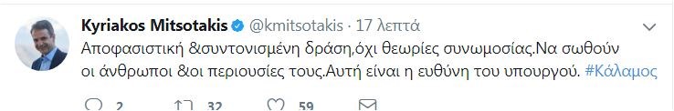 Tweet για την αντιμετώπιση της πυρκαγιάς στον Κάλαμο έκανε πριν από λίγο ο πρόεδρος της Νέας Δημοκρατίας, Κυριάκος Μητσοτάκης.«Αποφασιστική και συντονισμένη δράση, όχι θεωρίες συνωμοσίας. Να σωθούν οι άνθρωποι και οι περιουσίες τους. Αυτή είναι η ευθύνη του υπουργού. #Κάλαμος», έγραψε χαρακτηριστικά στον προσωπικό του λογαριασμό στο Twitter ο πρόεδρος της ΝΔ.