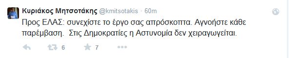Το περιστατικό που σημειώθηκε την Τετάρτη με πρωταγωνίστρια την Πρόεδρο της Βουλής, Ζωή Κωνσταντοπούλου και τον αξιωματικό της αστυνομίας, έξω από τη Βουλή, σχολιάζει με ανάρτηση στον προσωπικό του λογαριασμό στο Twitter ο Κυριάκος Μητσοτάκης. Συγκεκριμένα έγραψε: «Προς ΕΛΑΣ: συνεχίστε το έργο σας απρόσκοπτα. Αγνοήστε κάθε παρέμβαση. Στις Δημοκρατίες η Αστυνομία δεν χειραγωγείται».