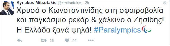 Mε ανάρτησή του στον προσωπικό του λογαριασμό στο Τwitter, o πρόεδρος της ΝΔ, Κυριάκος Μητσοτάκης έσπευσε να σχολιάσει την κατάκτηση του χρυσού μεταλλίου από τον Θανάση Κωνσταντινίδη και του χάλκινου από τον Δημήτρη Ζησίδη στην σφαιροβολία στους Παραολυμπιακούς Αγώνες.