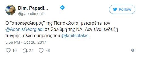 «Ο “αποκεφαλισμός” της Παπακώστα, μετατρέπει τον Άδωνι Γεωργιάδη σε “Σαλώμη της ΝΔ”. Δεν είναι ένδειξη πυγμής, αλλά ομηρείας του Κυριάκου Μητσοτάκη», αναφέρει σε ανάρτησή του στην σελίδα του στο Twitter, ο ευρωβουλευτής του ΣΥΡΙΖΑ και αντιπρόεδρος του Ευρωκοινοβουλίου, Δημήτρης Παπαδημούλης.