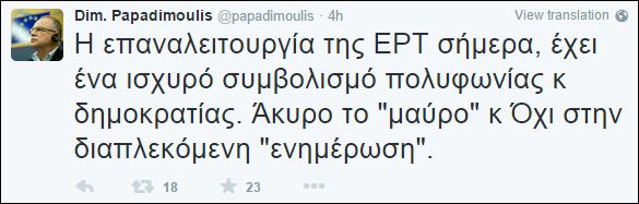 «Η επαναλειτουργία της ΕΡΤ σήμερα, έχει ένα ισχυρό συμβολισμό πολυφωνίας κ δημοκρατίας. Άκυρο το “μαύρο” κ Όχι στην διαπλεκόμενη “ενημέρωση”», αναφέρει το «τιτίβισμα» του αντιπροέδρου του Ευρωπαϊκού Κοινοβουλίου.