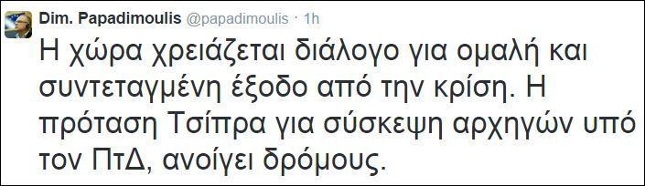 «Η χώρα χρειάζεται διάλογο για ομαλή και συντεταγμένη έξοδο από την κρίση. Η πρόταση Τσίπρα για σύσκεψη αρχηγών υπό τον ΠτΔ, ανοίγει δρόμους», έγραψε ο κ. Παπαδημούλης.