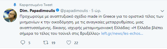 Σχολιάζοντας το δημοσίευμα της εφημερίδας Les Echos, για την έξοδο της Ελλάδας από το τούνελ, ο Δημήτρης Παπαδημούλης σημειώνει στον προσωπικό του λογαριασμό στο Twitter: