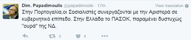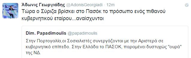 «Στην Πορτογαλία,οι Σοσιαλιστές συνεργάζονται με την Αριστερά σε κυβερνητικό επίπεδο. Στην Ελλάδα το ΠΑΣΟΚ, παραμένει δυστυχώς “ουρά” της ΝΔ», έγραψε χαρακτηριστικά ο αντιπρόεδρος του ευρωπαϊκού κοινοβουλίου, Δημήτρης Παπαδημούλης, με τον Άδωνι Γεωργιάδη να σχολιάζει: