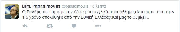 Συγκεκριμένα, ο κ. Παπαδημούλης, έγραψε: «Ο Ρανιέρι, που πήρε με την Λέστερ το αγγλικό πρωτάθλημα, είναι αυτός που πριν 1,5 χρόνο απολύθηκε από την Εθνική Ελλάδας. Και μας το θυμίζει…», ααφερόμενος στο «καρφί» του Ρανιέρι για την Ελλάδα στην τηλεόραση της Ράι.