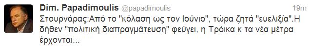 “Στουρνάρας: Από το “κόλαση ως τον Ιούνιο”, τώρα ζητά “ευελιξία”. Η δήθεν “πολιτική διαπραγμάτευση φεύγει, η Τρόικα και τα νέα μέτρα έρχονται…”, έγραψε στο twitter ο Δημήτρης Παπαδημούλης.