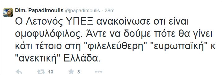 «Ο Λετονός ΥΠΕΞ ανακοίνωσε οτι είναι ομοφυλόφιλος. Άντε να δούμε πότε θα γίνει κάτι τέτοιο στη “φιλελεύθερη” “ευρωπαϊκή” κ “ανεκτική” Ελλάδα», έγραψε ο κ. Παπαδημούλης.