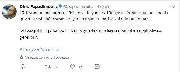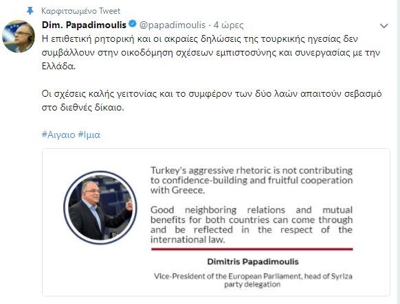 «Η επιθετική ρητορική και οι ακραίες δηλώσεις της τουρκικής ηγεσίας δεν συμβάλλουν στην οικοδόμηση σχέσεων εμπιστοσύνης και συνεργασίας με την Ελλάδα. Οι σχέσεις καλής γειτονίας και το συμφέρον των δύο λαών απαιτούν σεβασμό στο διεθνές δίκαιο» έγραψε ο αντιπρόεδρος του Ευρωκοινοβουλίου και στις δύο γλώσσες.