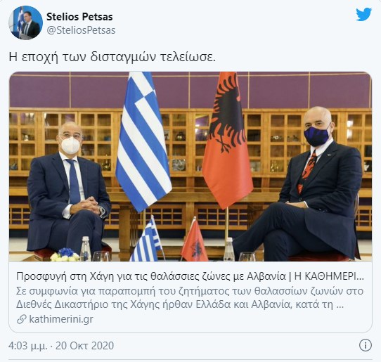 «Η εποχή των δισταγμών τελείωσε» έγραψε ο κυβερνητικός εκπρόσωπος Στέλιος Πέτσας στο twitter για τη συμφωνία Νίκου Δένδια – Έντι Ράμα σχετικά με την προσφυγή Ελλάδας – Αλβανίας στο διεθνές δικαστήριο της Χάγης, σχετικά με την οριοθέτηση της ΑΟΖ των δύο κρατών.