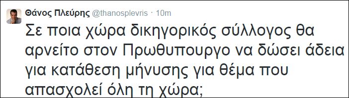 «Σε ποια χώρα δικηγορικός σύλλογος θα αρνείτο στον Πρωθυπουργό να δώσει άδεια για κατάθεση μήνυσης για θέμα που απασχολεί όλη τη χώρα;», έγραψε ο Θάνος Πλεύρης.