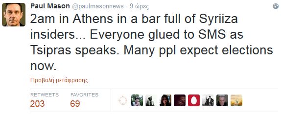 Σάλος στο διαδίκτυο από tweet του Πολ Μέισον, δημοσιογράφου στο Channel 4 τα ξημερώματα εν αναμονή της συνάντησης Τσίπρα – Γιούνκερ…