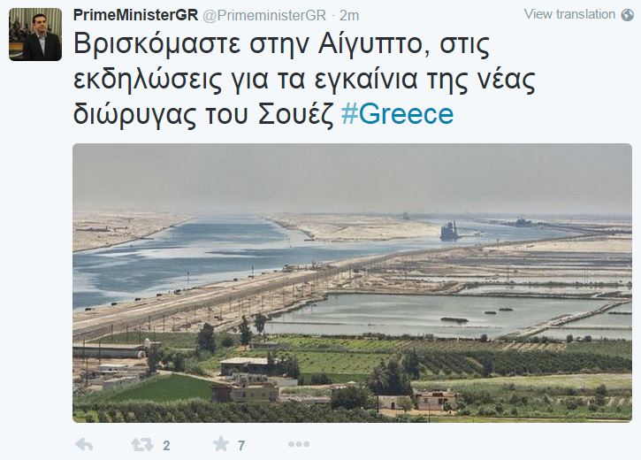 “Βρισκόμαστε στην Αίγυπτο, στις εκδηλώσεις για τα εγκαίνια της νέας διώρυγας του Σουέζ #Greece”, έγραψε χαρακτηριστικά, ποστάροντας και μια φωτογραφία, από τον… πρωθυπουργικό λογαριασμό στο twitter.