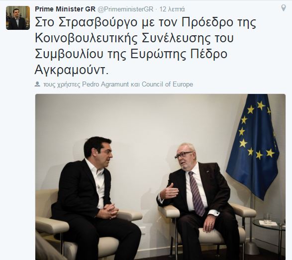 Όπως φαίνεται και στη φωτογραφία που ανέβασε στο Twitter, ο κ. Τσίπρας νωρίτερα είχε συνάντηση με τον Πρόεδρο της Κοινοβουλευτικής Συνέλευσης του Συμβουλίου της Ευρώπης, Πέδρο Αγκραμούντ.