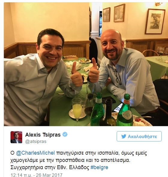 Η Εθνική ομάδα κατάφερε να πάρει πολύτιμο βαθμό, κόντρα στο Βέλγιο, στην προσπάθεια πρόκρισης στα τελικά του Mundial.Την αναμέτρηση με τους «κόκκινους διαβόλους» παρακολούθησε και ο Πρωθυπουργός, Αλέξης Τσίπρας, μαζί με τον ομόλογό του, Σαρλ Μισέλ, από το Βέλγιο και μετά το τέλος του αγώνα μοίρασε συγχαρητήρια, τόσο για το αποτέλεσμα, όσο και για την προσπάθεια.«Ο Σαρλ Μισέλ πανηγύρισε στην ισοπαλία, όμως εμείς χαμογελάμε με την προσπάθεια και το αποτέλεσμα. Συγχαρητήρια στην Εθνική Ελλάδος», ήταν το μήνυμά του.Δείτε το tweet του Πρωθυπουργού: