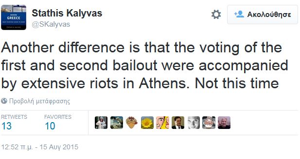 Ενώ σε ένα ακόμα tweet σημειώνει πως «μια ακόμη διαφορά είναι ότι η ψήφιση του πρώτου και του δεύτερου πακέτου διάσωσης συνοδεύονταν από εκτεταμένες ταραχές στην Αθήνα. ΟΧΙ αυτή τη φορά».