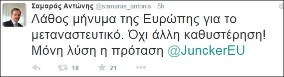 Να αλλάξουν τακτική στο θέμα του μεταναστευτικού καλεί τους ηγέτες της Ε.Ε. ο πρόεδρος της ΝΔ Αντώνης Σαμαράς. Ο κ. Σαμαράς ζητά μέσω Twitter να προχωρήσει η πρόταση του Ζαν Κλοντ Γιούνκερ. “Λάθος μήνυμα της Ευρώπης για το μεταναστευτικό. Όχι άλλη καθυστέρηση! Μόνη λύση η πρόταση Γιούνκερ” γράφει στον προσωπικό του λογαριασμό.