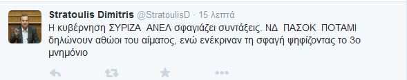 «Η κυβέρνηση ΣΥΡΙΖΑ ΑΝΕΛ σφαγιάζει συντάξεις. ΝΔ, ΠΑΣΟΚ, ΠΟΤΑΜΙ δηλώνουν αθώοι του αίματος, ενώ ενέκριναν τη σφαγή ψηφίζοντας το 3ο μνημόνιο», αναφέρει σε μήνυμά του στο Twitter o Δημήτρης Στρατούλης, μέλος του Πολιτικού Συμβουλίου της Λαϊκής Ενότητας και πρώην Αναπληρωτής Υπουργός Κοινωνικής Ασφάλισης.
