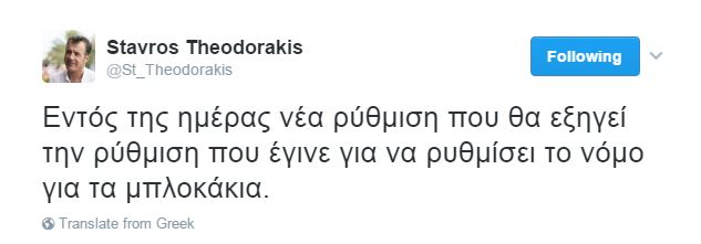 «Εντός της ημέρας νέα ρύθμιση που θα εξηγεί την ρύθμιση που έγινε για να ρυθμίσει το νόμο για τα μπλοκάκια» έγραψε ο κ. Θεοδωράκης.