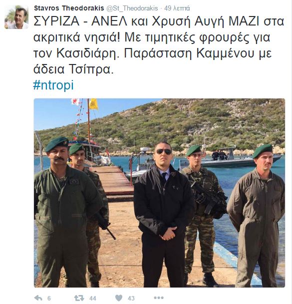«ΣΥΡΙΖΑ-ΑΝΕΛ και Χρυσή Αυγή ΜΑΖΙ στα ακριτικά νησιά! Με τιμητικές φρουρές για τον Κασιδιάρη. Παράσταση Καμμένου με άδεια Τσίπρα», έγραψε στον προσωπικό του λογαριασμό στο Twitter ο πρόεδρος του Ποταμιού, Σταύρος Θεοδωράκης.