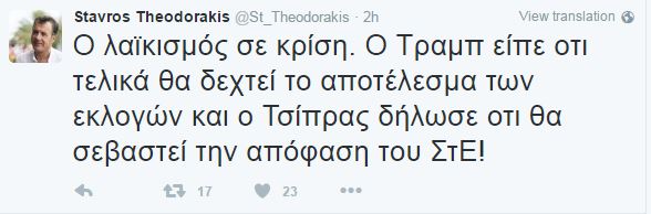 “Ο λαϊκισμός σε κρίση” έγραψε ο Θεοδωράκης και πρόσθεσε: “Ο Τραμπ είπε οτι τελικά θα δεχτεί το αποτέλεσμα των εκλογών και ο Τσίπρας δήλωσε ότι θα σεβαστεί την απόφαση του ΣτΕ”.