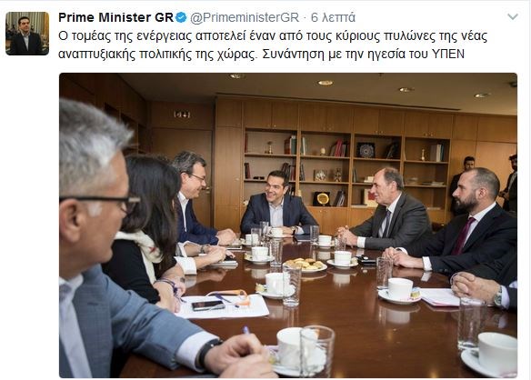 “Ο τομέας της ενέργειας αποτελεί έναν από τους κύριους πυλώνες της νέας αναπτυξιακής πολιτικής της χώρας. Συνάντηση με την ηγεσία του ΥΠΕΝ” έγραψε στο Twitter ο Πρωθυπουργός Αλέξης Τσίπρας μαζί με μία φωτογραφία από την επίσκεψή του στο υπουργείο.