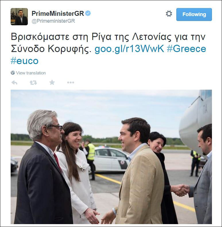 Ο Πρωθυπουργός ανέβασε μία φωτογραφία στο twitter κατά την άφιξή του και έγραψε: «Βρισκόμαστε στη Ρίγα της Λετονίας για τη Σύνοδο Κορυφής».