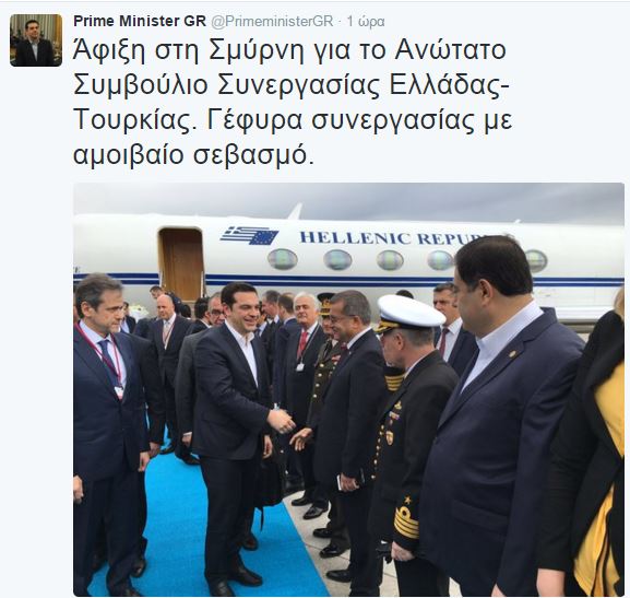 Φωτογραφία από την άφιξη του στη Σμύρνη, στο πλαίσιο του 4ου Ανωτάτου Συμβουλίου Συνεργασίας Ελλάδας – Τουρκίας, ανέβασε στο Twitter, ο Έλληνας Πρωθυπουργός Αλέξης Τσίπρας.