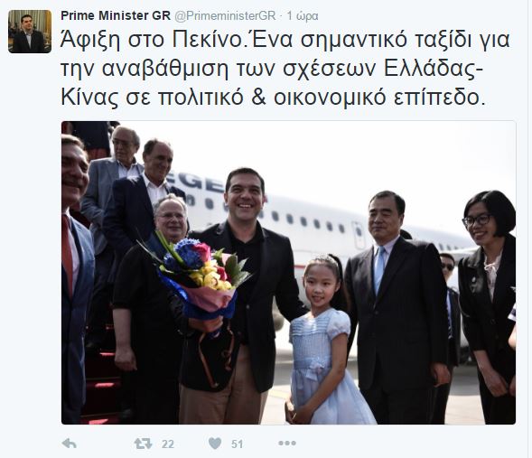 Σε ανάρτησή του στο Twitter για την άφιξη του στο Πεκίνο, ο Έλληνας Πρωθυπουργός αναφέρει: